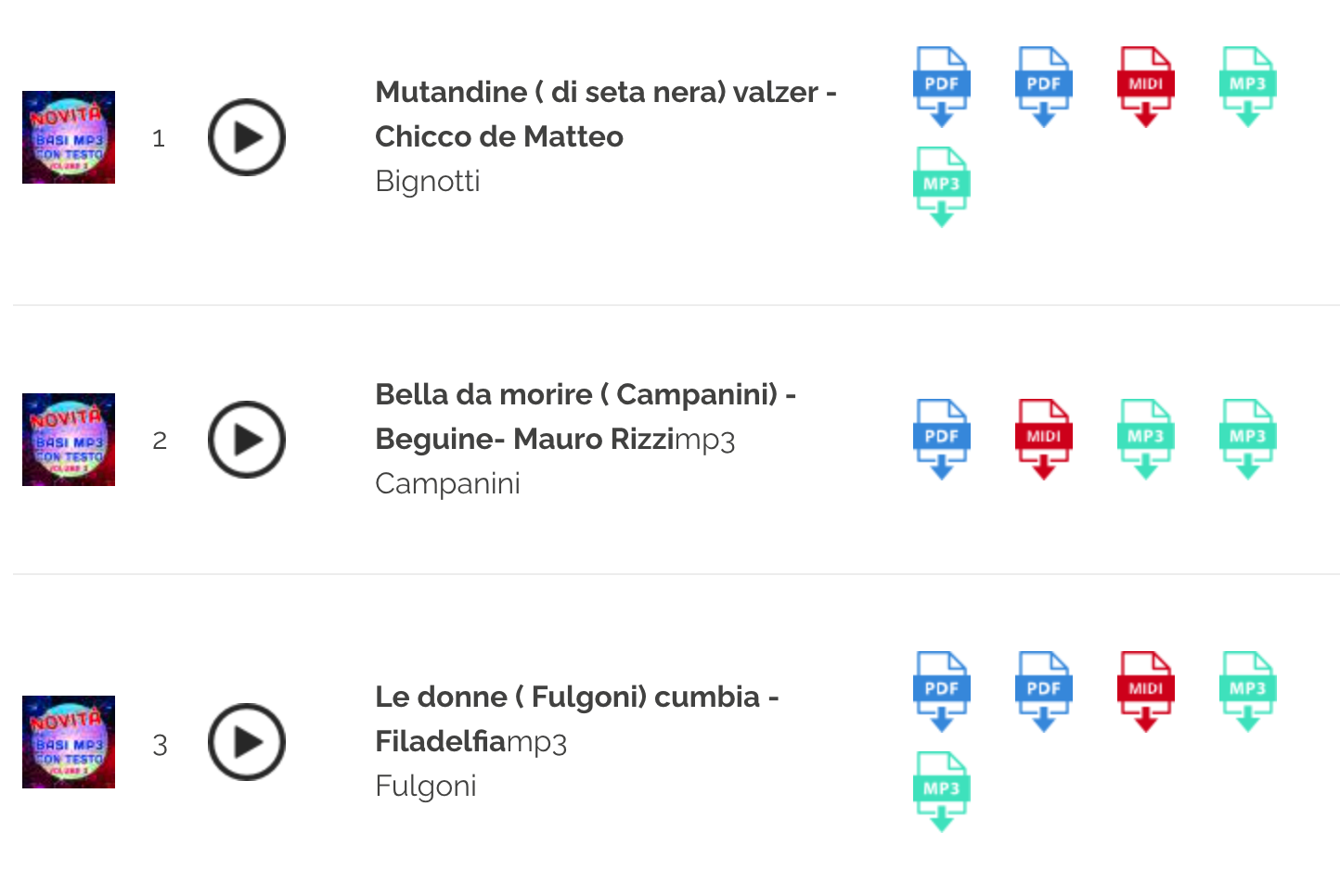 Ora puoi scaricare basi mp3, midi, spartiti e testi delle varie canzoni presenti in catalogo. Per farlo è sufficiente accedere alle schede dei vari brani dalla sezione Catalogo. Qui saranno presenti, accanto ai titoli delle canzoni, le icone per scaricare i file. Se invece state cercando un titolo specifico digitatelo nella casella "Cerca" in alto a destra: vi appariranno gli album nei quali quel titolo è contenuto.